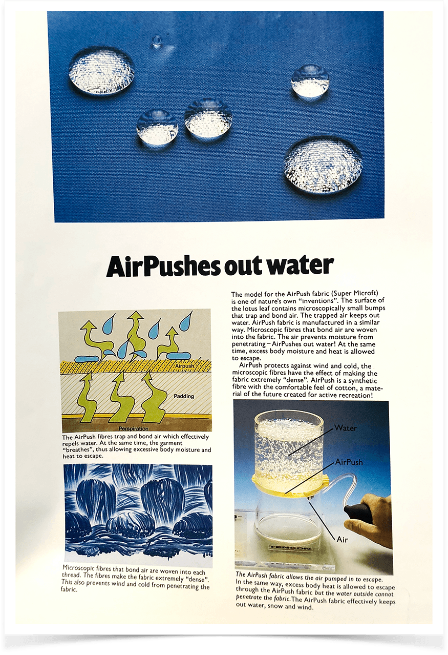 Tenson představuje nový materiál AirPush, který je vyroben z mikrovlákna s důrazem na vysokou prodyšnost. AirPush poskytuje absolutní volnost v pohybu pro jakoukoliv aktivitu, která vyžaduje komfort a vynikající prodyšnost spolu s odolností vůči větru a vodě.